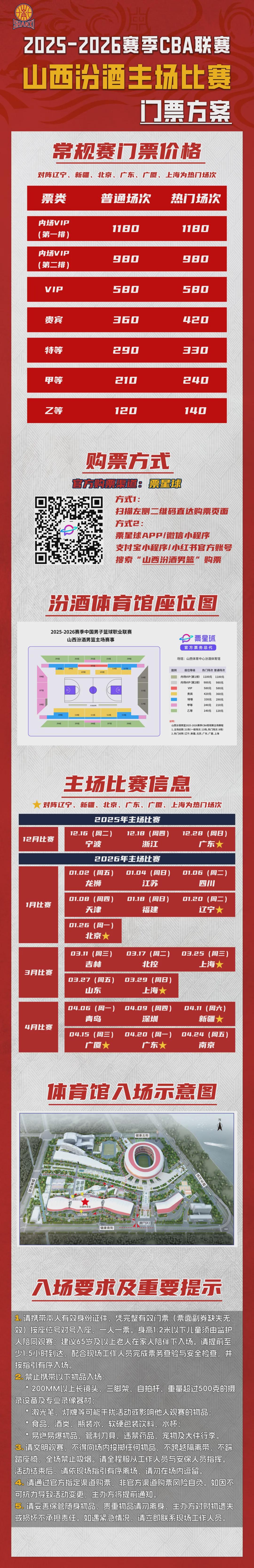 2025-2026赛季CBA联赛常规赛第13轮已经结束,山西汾酒男篮目前正在进行三连客征程。1月18日,球队将回归主场,迎战福建晋江文旅。同时,一月仅剩三轮主场比赛,相关赛事门票将于2026年1月13日10时正式开售!速速锁定官方票务平台“票星球”,让我们继续并肩,捍卫主场!